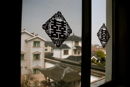 The symbol for double happiness was cut out of red paper and pasted on the windows. Double happiness signifies a wedding.